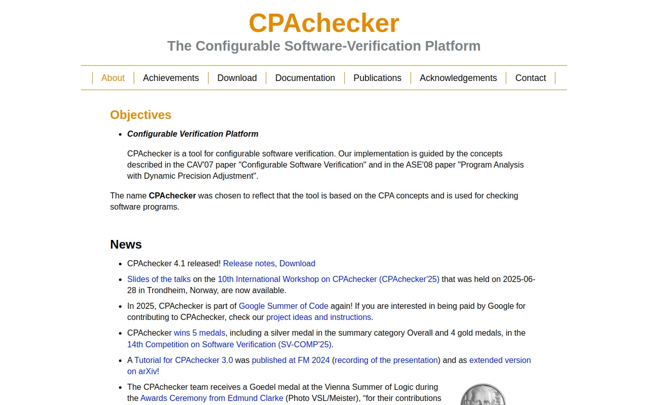 A tool for configurable software verification of C programs. The name CPAchecker was chosen to reflect that the tool is based on the CPA concepts and is used for checking software programs.