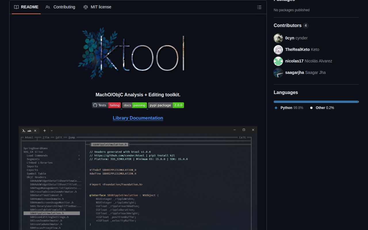 Fully cross-platform toolkit and library for MachO+Obj-C editing/analysis. Includes a cli kit, a curses GUI, ObjC header dumping, and much more.